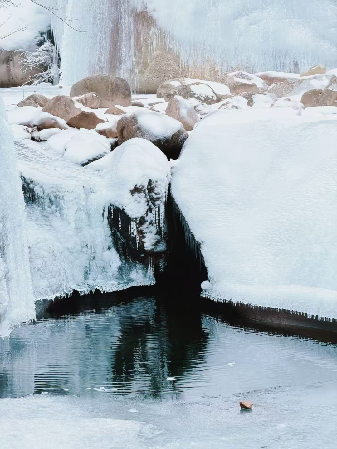 沿着木栈道缓缓前行,沿途冰挂垂帘、寒潭静谧,偶尔能听到冰下潺潺水声,动静交织间藏着不为人知的神秘韵味。